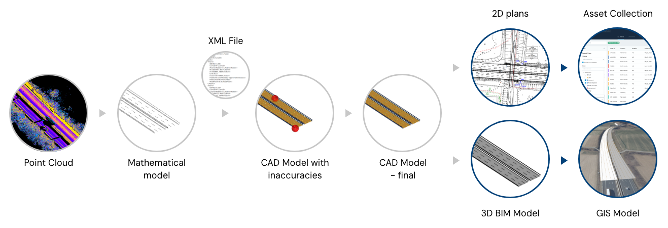 Our powerful tool transforms raw point cloud data into highly accurate highway models with a streamlined, three-module process. Module 1 filters irrelevant data and extracts highway objects, generating an XML-based exchange file with precise mathematical definitions. Module 2 converts this into CAD models with 90-95% accuracy, highlighting any imperfections detected in previous step. Module 3 then refines and corrects these areas, achieving a fully accurate native model. A built-in feedback loop continuously enhances the process, ensuring ever-improving precision for future data analysis.
