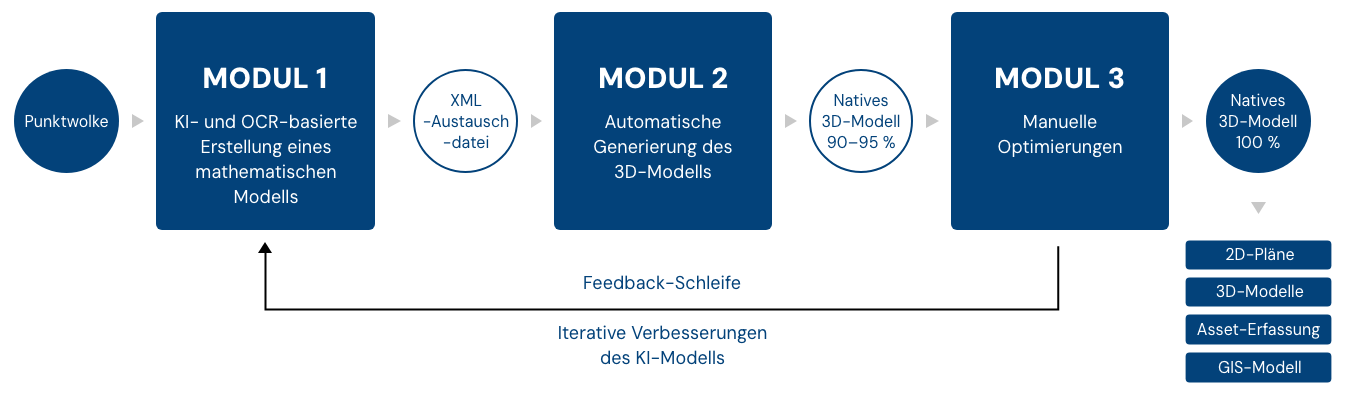 Die extrahierten Daten werden in eine XML-Austauschdatei mit geometrischen und semantischen Informationen überführt. Unsichere Erkennungen werden visuell gekennzeichnet, was Modul 3 bei der weiteren Verfeinerung leitet. Eine integrierte Feedback-Schleife erhöht kontinuierlich die Genauigkeit und gewährleistet eine reibungslose Modellierung.
